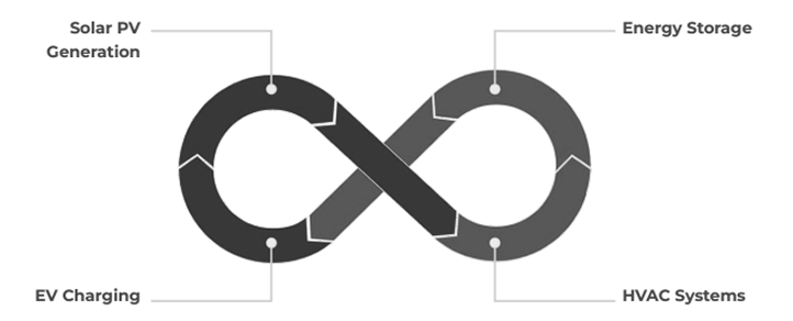 Solar generation, intelligent storage, efficient climate control, and clean mobility all work together through a connected energy management platform.